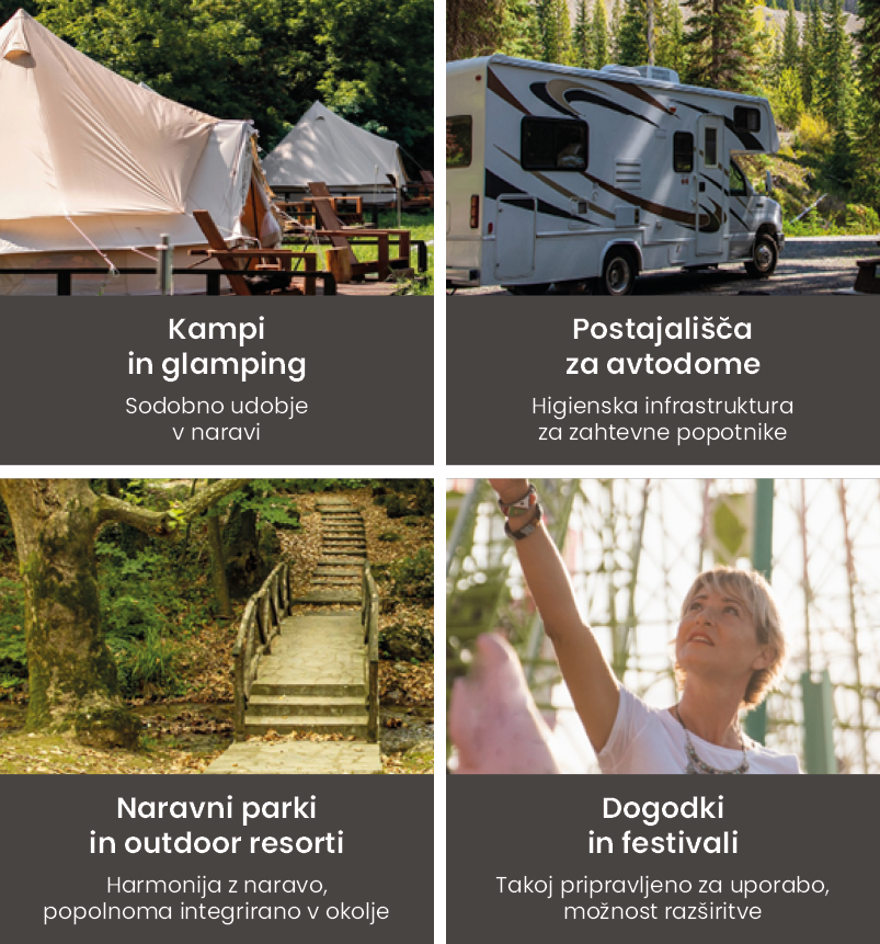 Ponuja visokokakovostno, trajnostno in popolnoma opremljeno infrastrukturo za kamp prostore in glamping namestitve, parkirišča za avtodome, naravne parke in outdoor letovišča, javne in turistične objekte, parkirišča za tovornjake in voznike na daljših poteh ter trajna prireditvena in razstavna prizorišča.