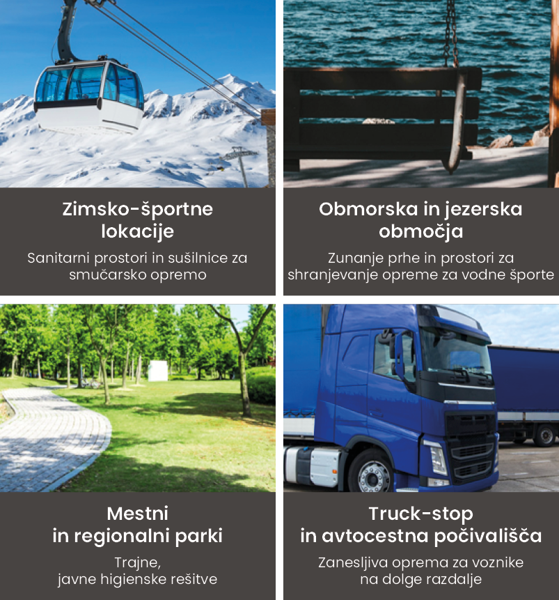 STANDARD linija - Pomeni zanesljivo funkcionalnost in je idealna za množično obiskane lokacije, kot so festivali, počivališča ali javni objekti. Ponuja vse, kar je potrebno za zanesljivo delovanje – jasno strukturirani objekt, enostavni za čiščenje in takoj pripravljen za uporabo.
